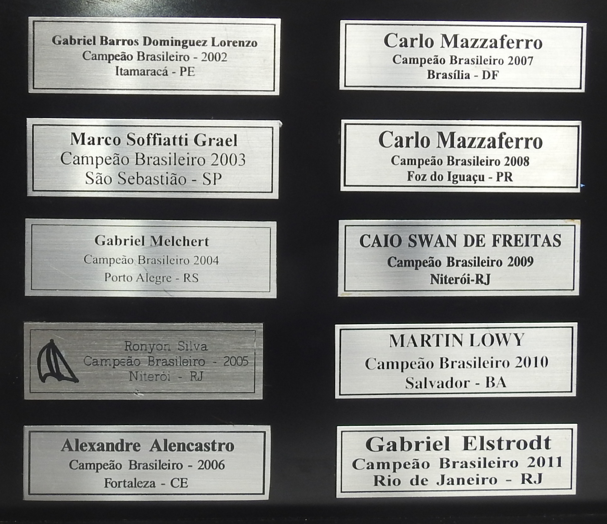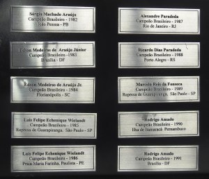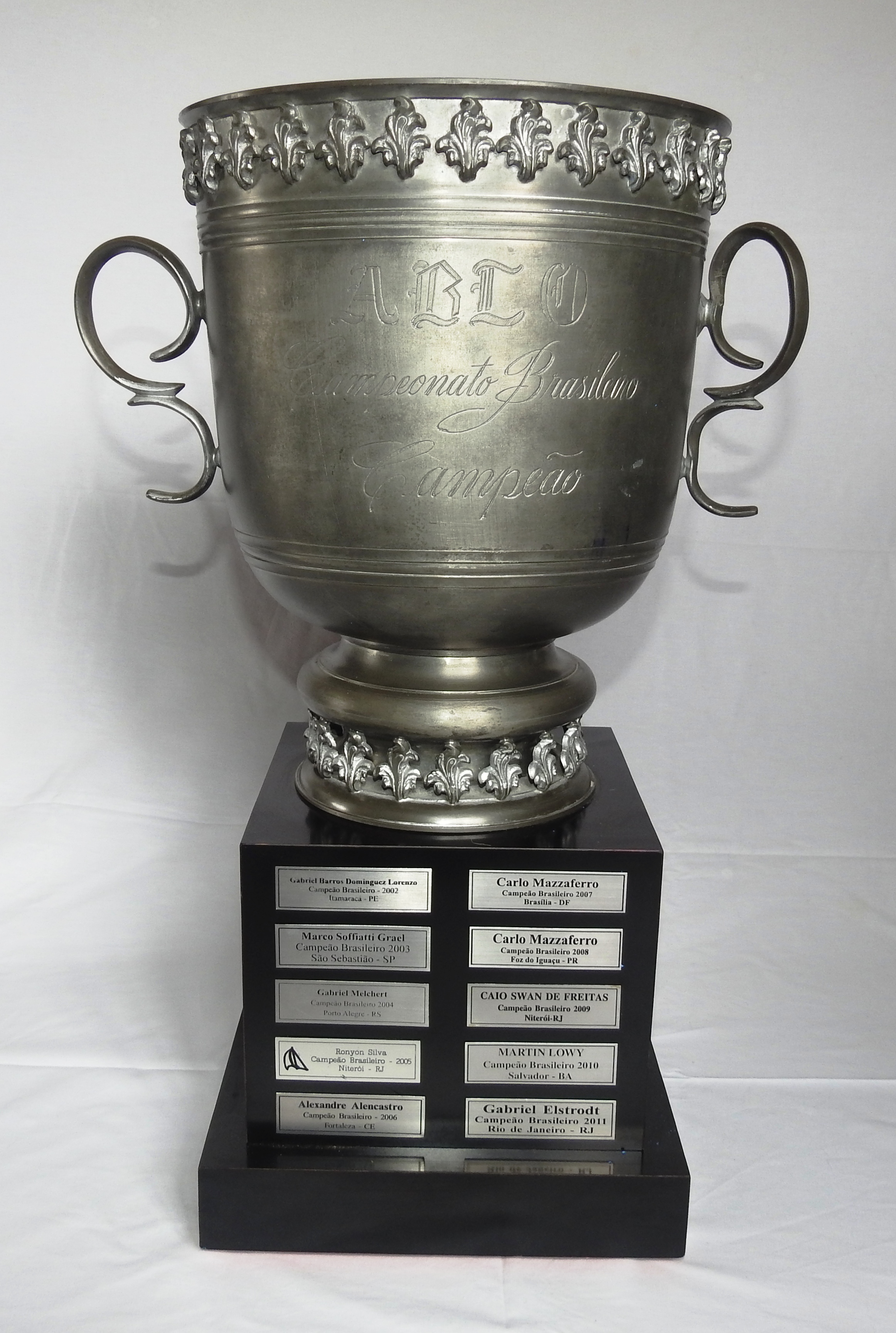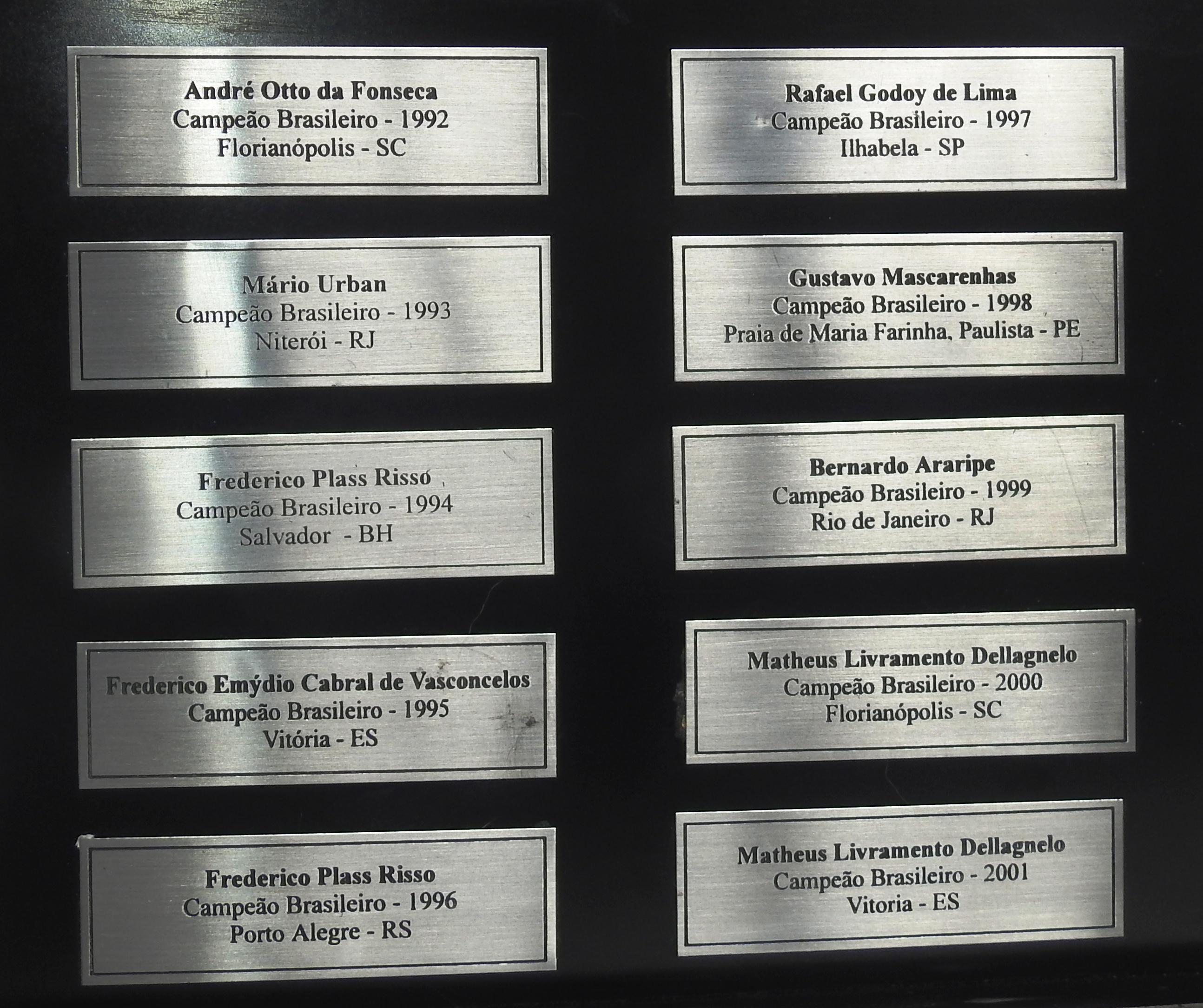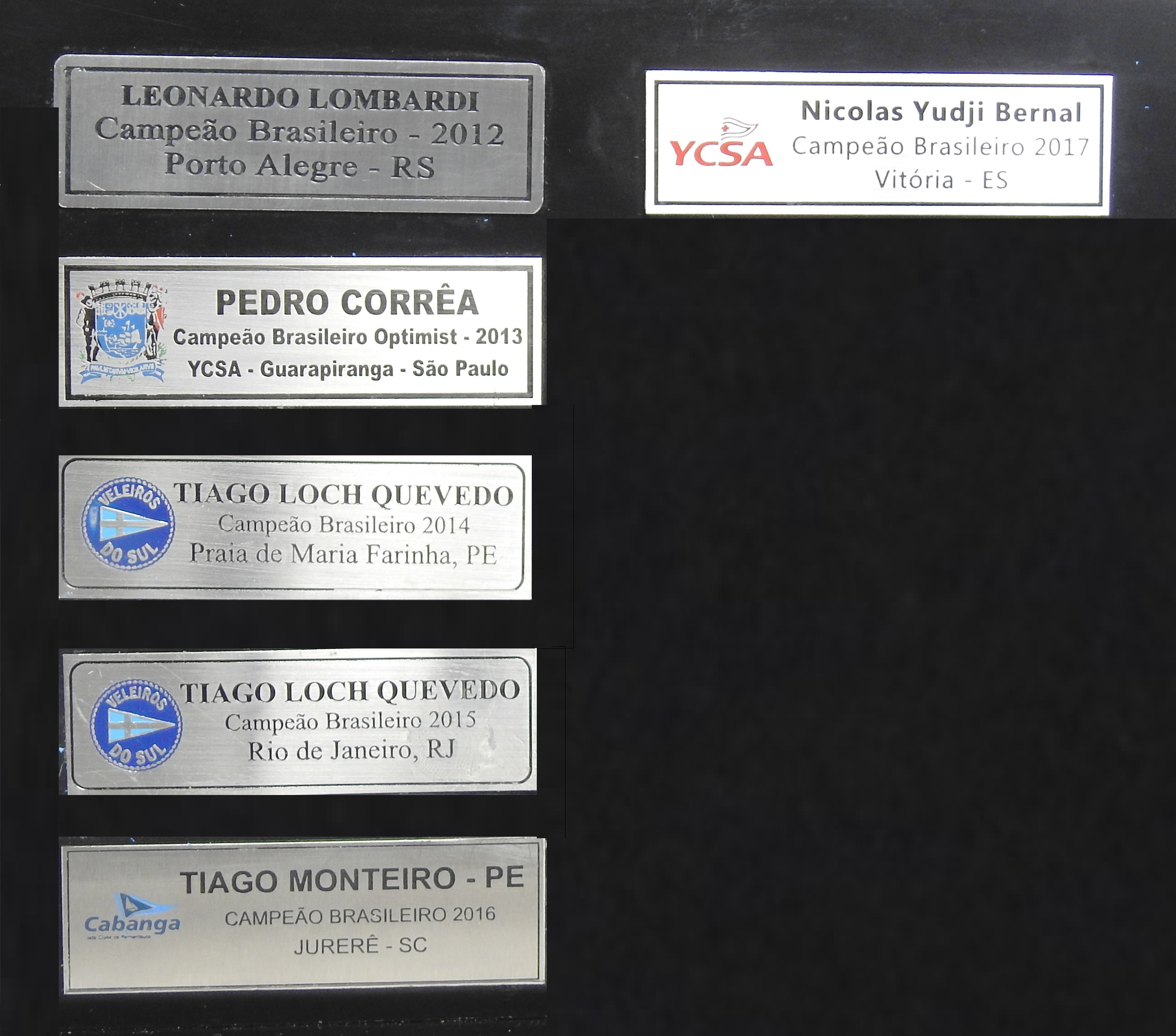 O atual troféu de campeão geral possui placas dos 36 velejadores que foram campeões brasileiros a partir de 1982 . Confira nas fotos a seguir as placas dos campeões a partir de 1982: